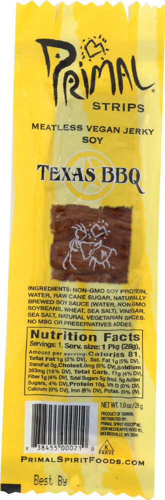 PRIMAL STRIPS: Meatless Vegan Jerky Soya Texas BBQ, 1 oz